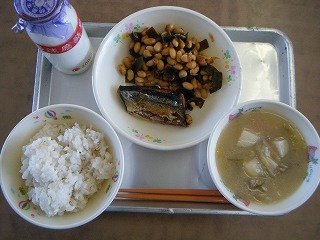 さんまをかば焼きで頂きます。うの花で大豆のたんぱく質もとれる大人の味の給食です。