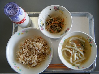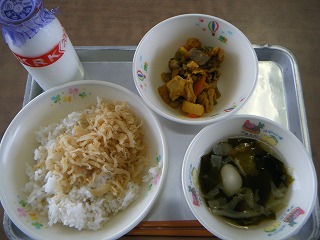 五目ごはん 海藻サラダ おでん デザート 牛乳