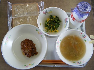 黒糖パン ハンバーグのデミソースかけ グリーンサラダ ポテトのスープ 牛乳