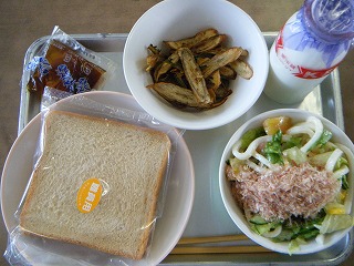 黒糖パン  冷やしぶっかけうどん  かつおぶし  一食めんつゆ  野菜チップス  牛乳