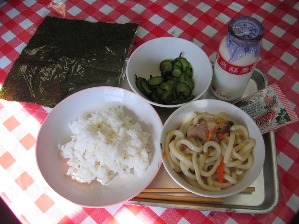 セルフおにぎり   きゅうりの昆布和え   煮込みうどん   牛乳