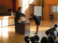まず、八代小体連陸上記録会と読書感想画コンクールにおいて、入賞した児童の表彰がありました。表彰を受けた児童に限らず、記録会に参加した6年生、感想画を描いたたくさんの子どもたち、みんなよく頑張りました!