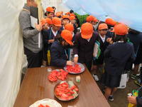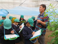 初めに、郡築の本田農園さん(トマト農家)を訪問しました。はちべえトマトについてのお話を聞かせてもらったり、ビニールハウス内を見学させてもらったりしました。その中で、新鮮でおいしいトマトを食べさせていただきました!