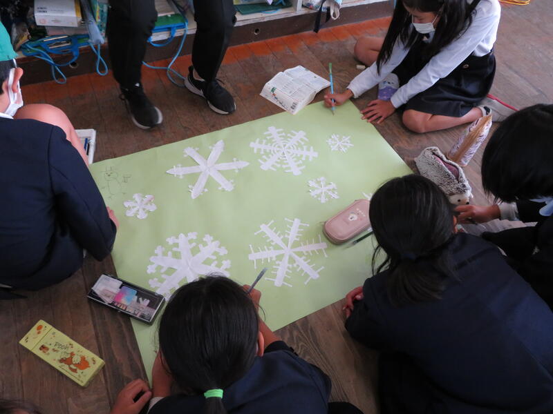 きれいな雪の結晶を切り絵で作り、広用紙に貼って一つの大きな作品に仕上げていました!