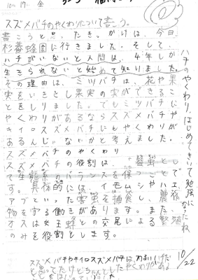 スズメバチの事についてくわしく書けていますね。ハチがいないと人間は4年しか生きられないことを知りました。