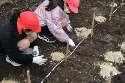2月19日の3時間目に、5年生は、ジャガイモの植え付けをしました。