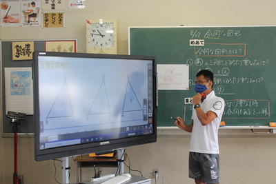 対策として、フェイスガードを装着しての授業を開始しました。口元が見えることで、子どもたちの学習に対する集中力も更に高まっています。