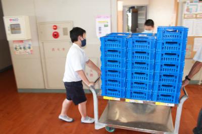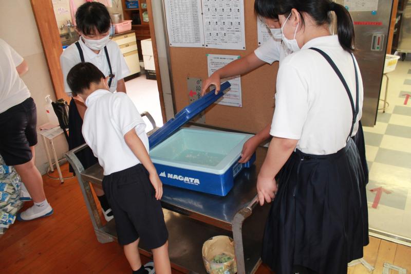 6年生が給食の時間に1年生へ呼びかけをしている様子です。