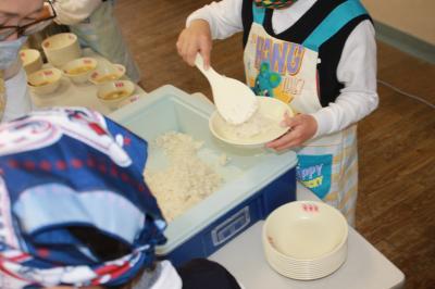 そして、担任と一緒に、豚汁やご飯をつぎ分けて食べることができました。