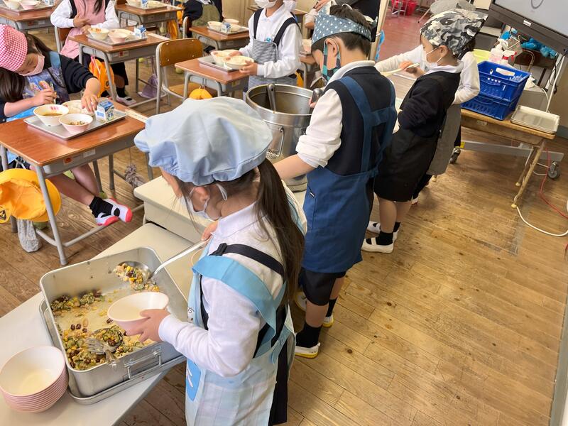 3年生以上の学年は、12日(水)よりスタートしていましたが、1・2年生はこの日がスタート。特に1年生は初めての給食当番で、担任の先生方に教えてもらいながら、上手につぎ分けていました。これから好き嫌いなく、感謝しておいしくいただきます!