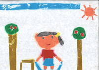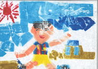 私が工夫したところは、いろいろな場面を描いていて、風が左から右に向かって吹いているところを工夫しました。特に工夫したところは、下の場面です。本当は、妹はなくなっているけれども、二人が大人になった時の場面を想像して描いたところです。