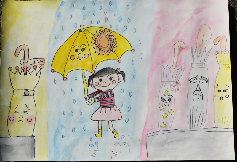 この物語を読んで、私とメアリー=ジョーは似ていると思いました。その理由は、私もみんなが、ちゃんと聞いてくれるかなとか、本当のことは言ってもいいのかと不安になることがあるからです。私が描いた絵で、工夫したところは、自分で想像して色づけをしたところです。他にも色の濃い、薄いを分けながら、同じ色にしないことを心がけ、彩色をしました。
