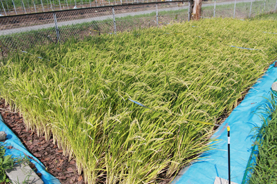 (5年生の栽培している稲穂が刈り取りの時期を迎えています。)