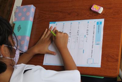 ひらがなの学習は、書きやすい「つ」や「く」などから始まります。そして徐々に難しいひらがなになります。5月の分散登校中も学校で習った文字の練習を家庭で頑張っていました。(1年生の担任より)