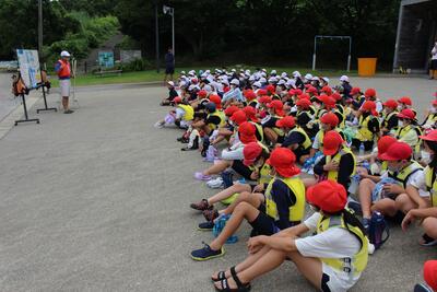 分団子ばと会が開催されました。例年だと、1年生から6年生までの分団員一同に集まって夏休み前の反省や夏休みの暮らしについて話合いをする予定でしたが、新型コロナ感染防止のため、全員集会を避け、登校班長会を体育館で実施しました。