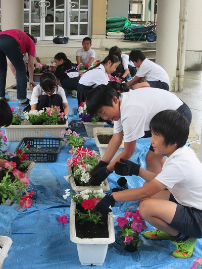 5日、委員会活動の時間、飼育・栽培委員会はプランターへの花苗植えをしました。