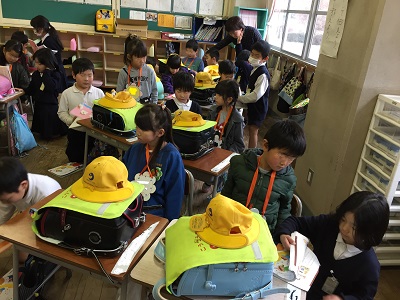 いつもは、その場で身を守る姿勢をして、どちらの方向に避難するかを指さします。