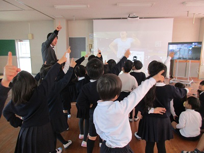 室小の子どもたちは、いろいろな縄跳びの仕方を実際に跳びながら教えました。