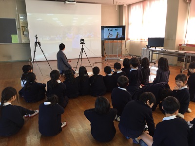 その際に、大同小の子どもと室小の子どもがお互いに英語の絵本を読み合ったりして、スクリーンを通してですが一緒に授業を受けることができました。