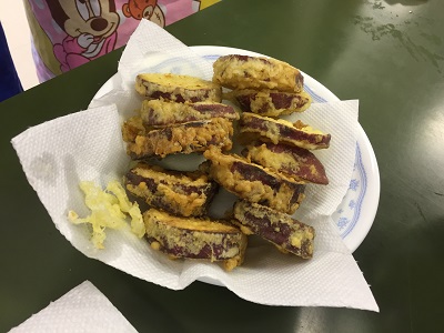 土から出てきた紅はるかは、子どもたちの手によって、おいしい「いも天」へと変身しました。