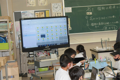 今回は、5年生の理科の「植物の発芽と成長」の学習において、配布されたデジタルシートを教師に提出して、お互いの考えを共有して理解を深める学習をしました。