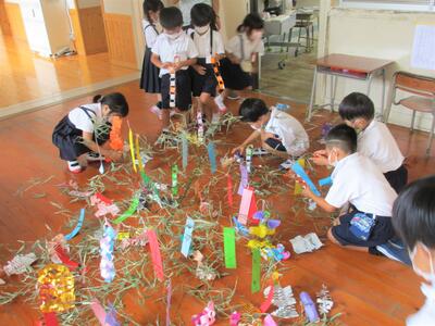 今日は七夕です。七夕かざりを作っている1年生の姿がありました。はさみを上手に使って、きれいなかざりがたくさんできました。飾り終わった笹を持ち上げると、「おおー!」と歓声が上がっていました。