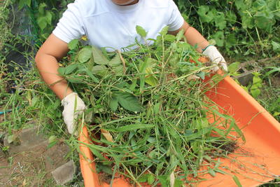 夏休み前に、2年生の子どもたちは、自分たちが栽培しているミニトマトを置いている場所や野菜を育てている場所の草取りをしました。