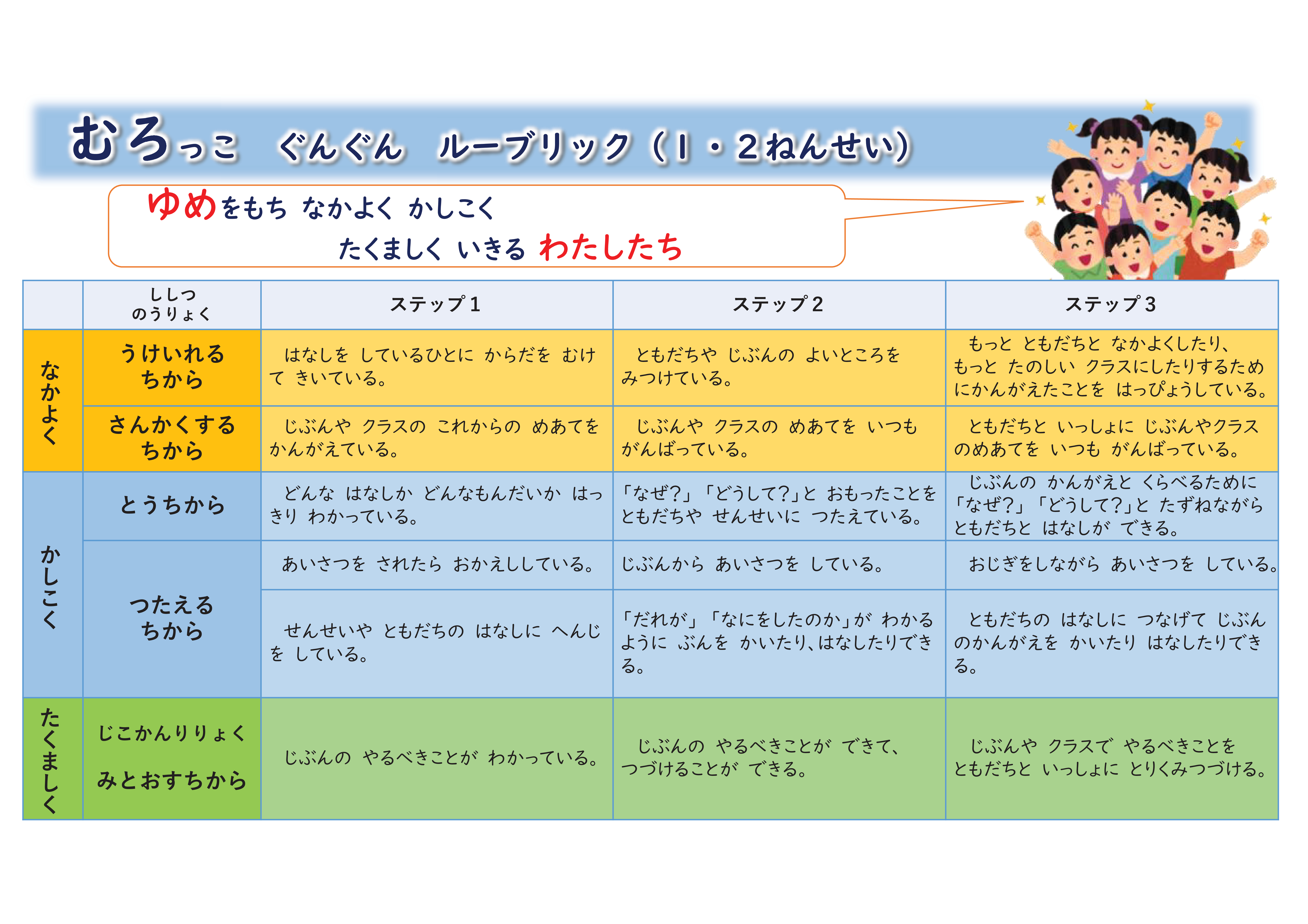 ○ 「室っ子ぐんぐんルーブリック」の“アップデート”を見据えて、室小がもつよみや課題を、大人と子供が一緒に考え、目標を共有する。