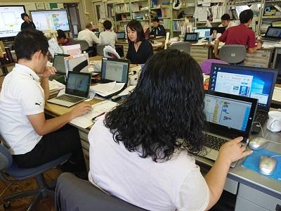 夏休みに講師としてサポートスクエアのICT支援員の方々をお迎えして、情報教育についての校内研修を行いました。