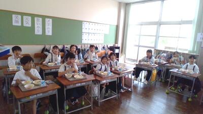 この日の給食は、麦ごはん・キムチ入り豚汁・ちぐさやき・お抹茶ふりかけ・牛乳でした。中国語を話せる室小の児童が通訳をして、味の感想や会話を楽しんでいる学級もあったようです。楽しく給食時間の交流ができました。