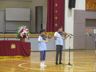 続いて、大同小学校と室小学校からの発表がありました。室小学校は、きらきら星を中国語で歌いました。それぞれの学級で練習を重ね4年生から6年生までの児童で発表しました。大同小学校からは、大きな古時計の歌や、天空の城ラピュタのバイオリン演奏、千本桜のダンスの披露がありました。時間を掛けてたくさん練習してきてくれたそうです。日本語で歌う場面もあり、室小の子ども達も、手拍子をしたり一緒に歌ったりして盛り上がっていました。素敵な発表をありがとうございました。