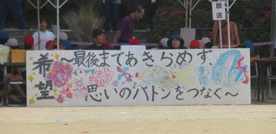 5年生は、リレー「いつ走るの?今でしょ!!」、表現・集団演技「思いのバトンを未来につなぐ」を頑張っていました。リレーでは、お互いに協力し合い、助け合い、みなさん頑張っていました。5年生の人の中には、応援団を頑張り、自分の団を一生けん命応援していました。