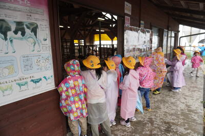10月7日(月)に、1年生の見学旅行がありました。行き先は、阿蘇ミルク牧場でした。初めての見学旅行ということで子どもたちは、しおりをもらった時からわくわくしていました。当日は、あいにくの雨でした。かっぱを着て、傘をさして、牛舎やポニーの家、動物ふれあい広場などをクラスごとに周りました。