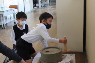 2年生が、生活科の学習として、大豆を育て、収穫をして、それを加工するという学習を行いました。むかしの道具の石臼を実際に使って加工しました。