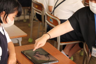 また、上の写真は、先生が子どもたちに、タブレットを使って、 eライブラリアドバンスの使い方を個別指導している場面です。