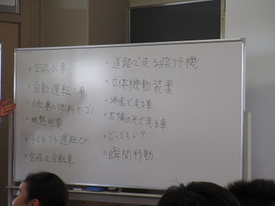 最後に、「未来のこと」を考え、2030年の交通について予想し、子どもたちからは「空飛ぶ車や太陽光で走る車ができるのではないか」と意見が出されました。