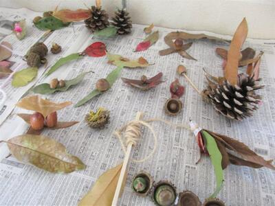 1年生が生活科の秋探しで見つけてきたどんぐりや落ち葉で作った作品たちです。人の顔やうさぎ、こまに釣り竿など、かわいらしい作品がたくさんです。
