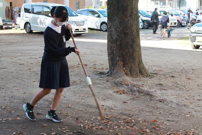 6年生の子供たちが、一生懸命に落ち葉を集めて、掃除を頑張っています。