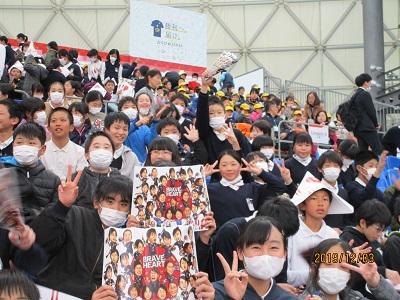 2年生が作った手作りの旗を持ち、一人一つずつ手作りの「がんばれ!!おりひめJAPAN」と書いた帽子をかぶって応援しました。