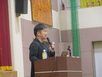 11月14日(金)の3年生の室っ子ラボでは、大津町教育委員の大村詠一さんに講話をしていただきました。大村さんは、幼いころに一型糖尿病を発症しておられます。ご病気と向き合いながらエアロビックに取り組まれ、世界大会で優勝された実績もあります。