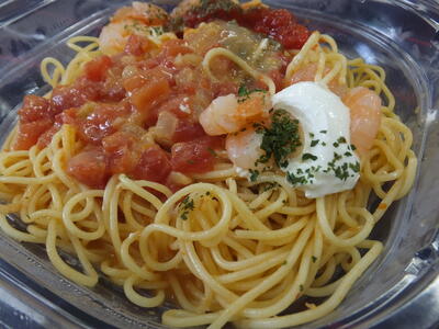 (Cold Pasta, Shrimp, Cheese, Tomato Sauce)