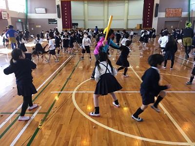 その時間は1・2年生が体育館で「心の鬼」を退治するという活動を行っていました。