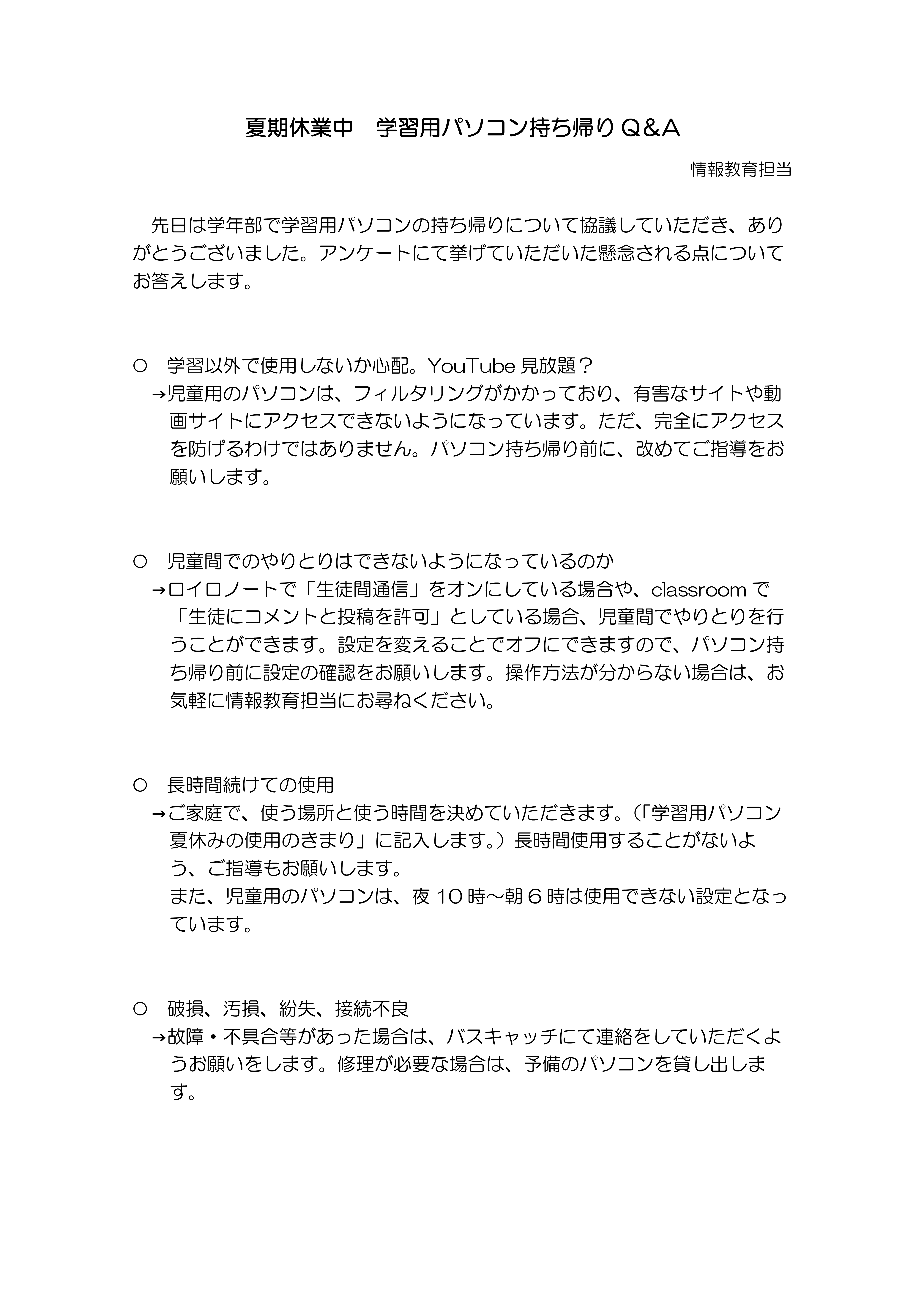 学習用パソコン 夏休みの使用のきまり