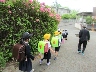 入学したての1年生は、2年生と一緒に歩いて下校をしています。2年生は1年生の歩くスピードを考えながら、様子を見ながら、1年生を引っ張っていってくれています。すっかりお兄さん・お姉さんの顔になった頼もしい2年生たちです。