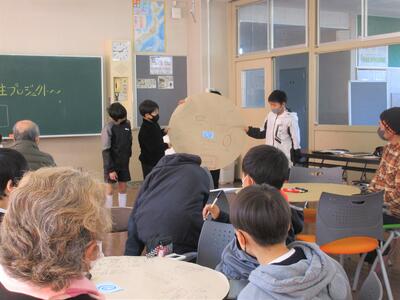 今回は、松本区長さんをはじめ保護者・地域の方々をお招きし、掲示委員会の子どもたちと自由に意見を出し合いました。円卓型のボード、「えんたくん」を使って意見を書き出し、集約していきます。