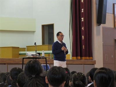 人権教育講演会では、子どもたち、保護者の皆さまと共に坂本義喜さんのお話を聞きました。