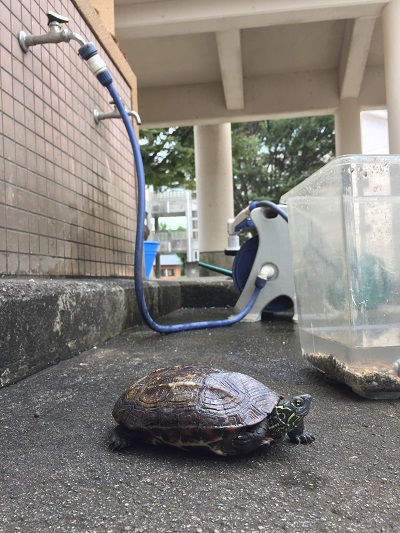 カメも子どもたちの登校に備え、筋トレに励んでいます。