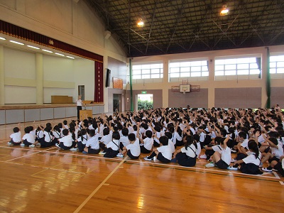 後半が始まる集会では、転入生の紹介や、校長の話、今月の目標の発表がありました。