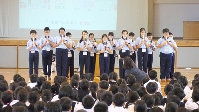 続いて大同小学校からは高雄市や学校の紹介、リコーダー演奏などが、室小からは歓迎の挨拶と1,2年生からの歌のプレゼントがありました。