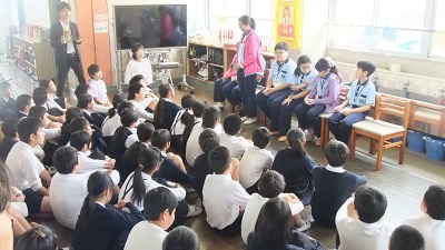 そして、すべての体験が終わった後、つながる学校のスクリーンをとおして、大同小の子どもたちが、現地に残った子どもたちと直接話をしました。